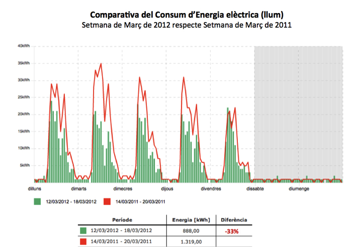 Després d’uns mesos des de la implantació del projecte a l’inici d’aquest curs 2011-12, estem constatant importants estalvis mensuals amb reduccions del consum d’electricitat que oscil·len entre el 20% i el 30% dels consums enregistrats en els mateixos períodes de l’any passat, i que econòmicament suposen estalvis que poden ser invertits en la millora de l’eficiència de l’edifici. Però deixant a banda els bons resultats obtinguts, cal insistir en el treball diari amb alumnes, professors i personal de servei, per aconseguir integrar i consolidar totalment el canvi d'hàbits que implica aquest projecte a nivell de tota la comunitat, i per tant, hem de continuar treballant per millorar l’abast i l’eficàcia de les actuacions.